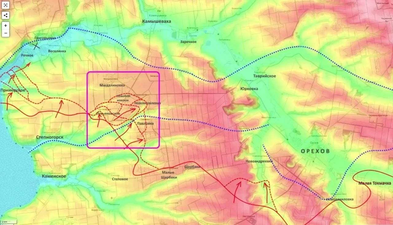 Освобождение Еленовки (Жданово) привело к разрыву сплошной линии обороны. В районе Прилук штурмовые подразделения продвинулись на глубину до 2,5 км. Это продвижение расширяет плацдарм вдоль русла реки и открывает направление на Орехов. До Никольского, важного логистического узла, остаётся около 20 км, большая часть которых представляет собой открытую местность.