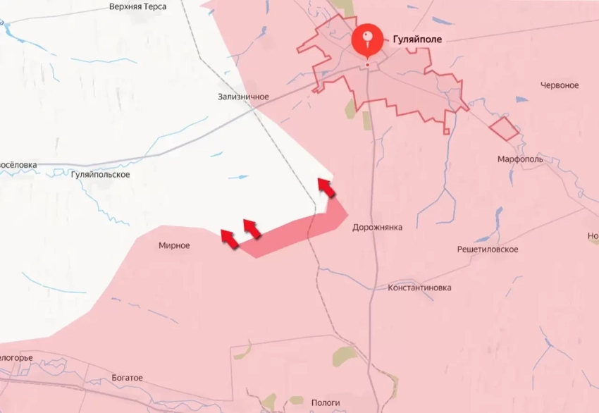 В Запорожской области фиксируется новое продвижение российских Вооружённых сил. В ходе наступления на Гуляйпольском направлении российские войска взяли под контроль территории к востоку и западу от железнодорожной ветки в районе сёл Мирное и Дорожнянка.