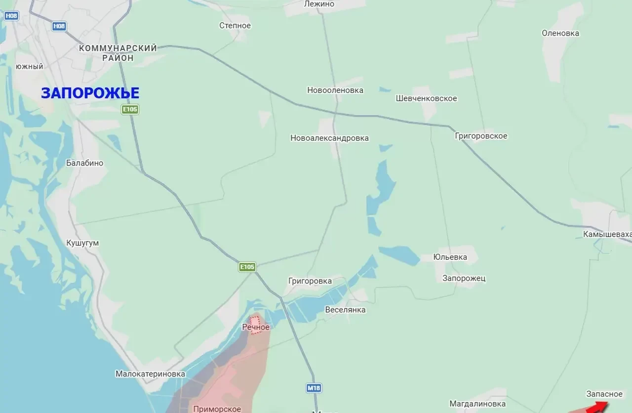 Российские войска продолжают развивать успех в Запорожской области. В результате успешных действий в районе Малокатериноского лимана (место впадения реки Конка в Каховское водохранилище) было освобождено село Речное. Оно находится на южном берегу Конки, в непосредственной близости от автомобильной дороги Запорожье-Степногорск.