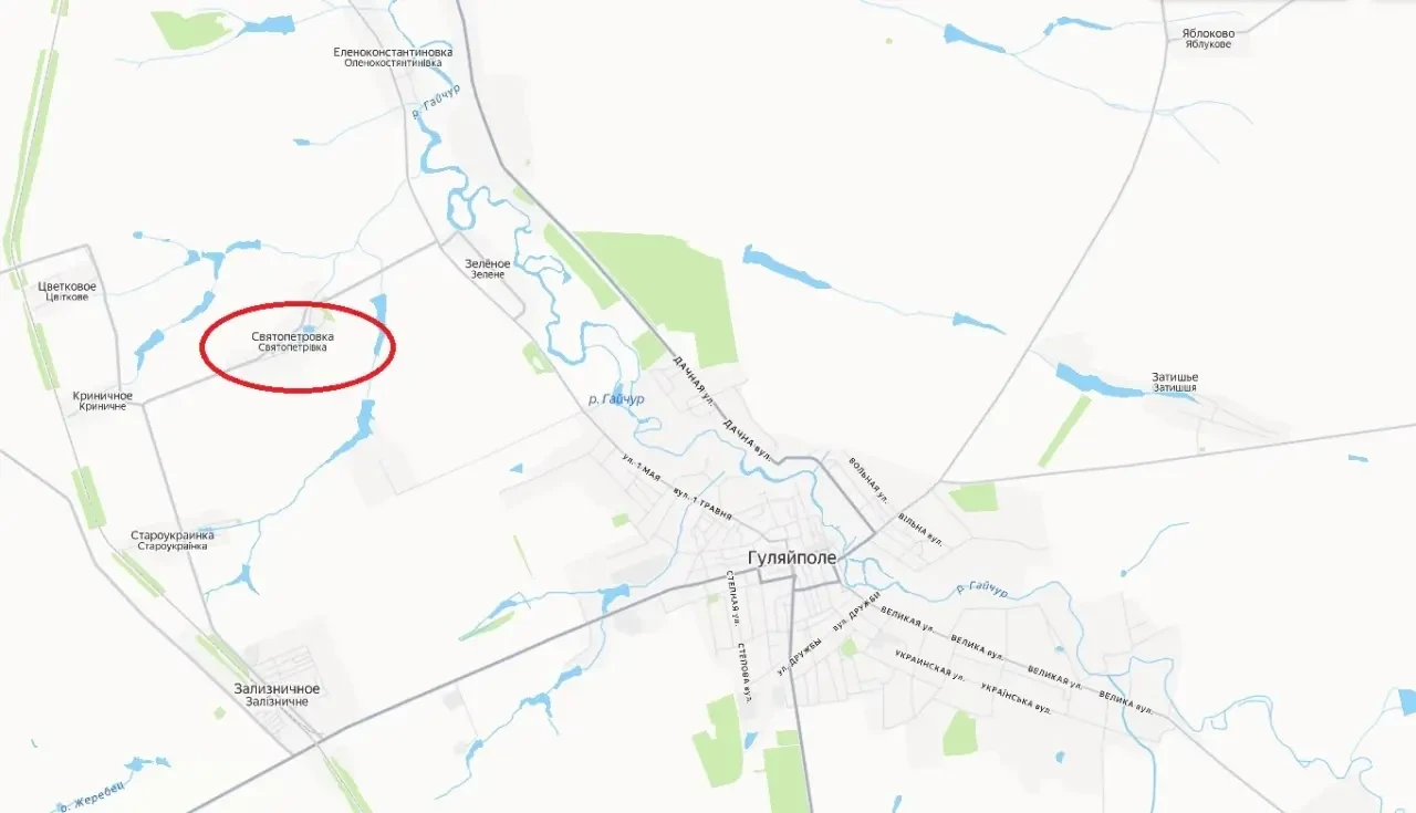 Подразделения армии России продолжают наступать в районе города Гуляйполе Запорожской области, буквально ежедневно освобождая новые населенные пункты. Поступают сообщения об освобождении села Петровка (украинское название Святопетровка), расположенного к северо-западу от Гуляйполя.