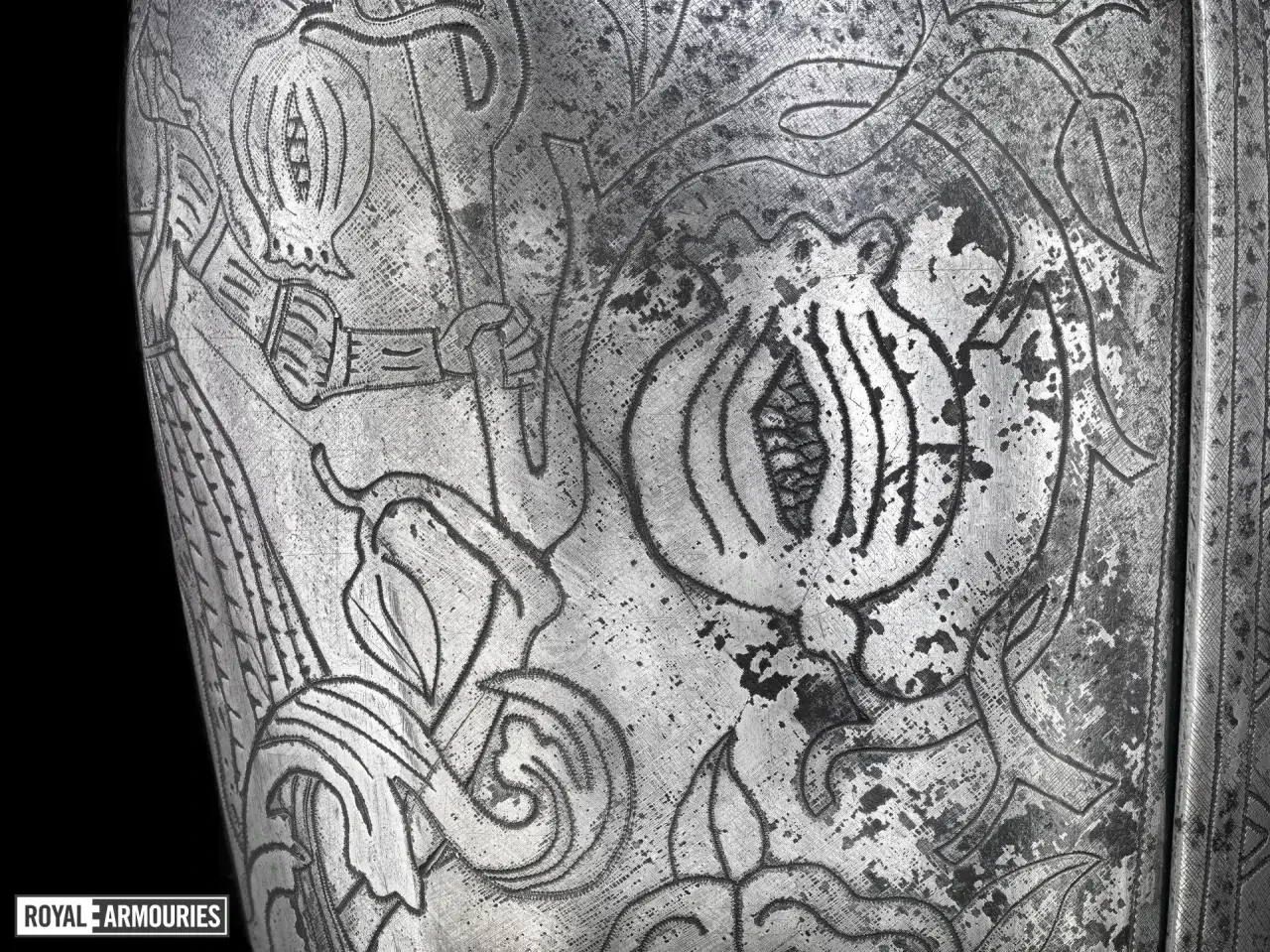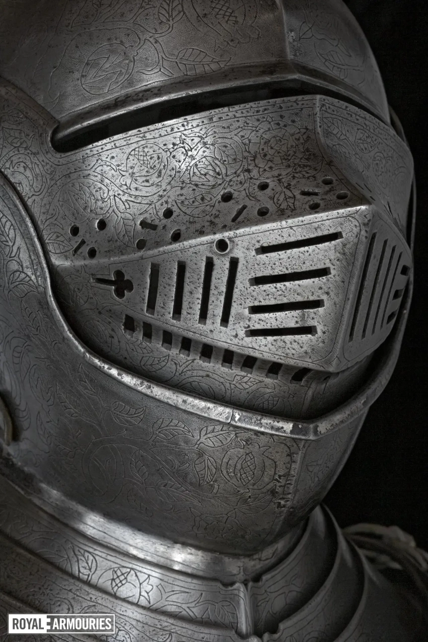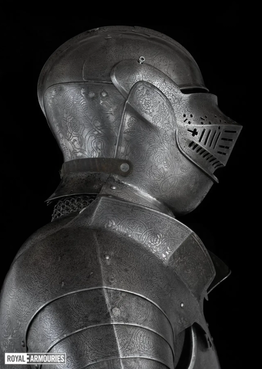 Интересно, что доспехи эти украшены множеством гравированных элементов. Металла, свободного от гравированных изображений, на них практически нет совсем. На нагруднике изображен Святой Георгий, а на спине — Святая Варвара. Остальная часть доспехов украшена узором из вьющихся ветвей, из которых произрастают тюдоровские розы и гранаты Гранады, а на набедренниках — геральдические лилии.