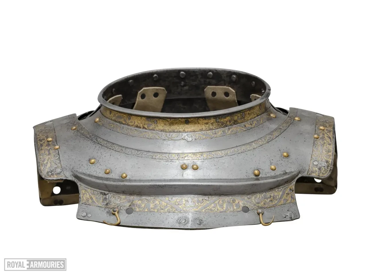 Шлем, по-видимому, изначально был изготовлен для крепления к верхней пластине горжета, но полый фланец на нижнем краю был удален. Сам горжет имеет две подвижные пластины на шее и должен был носиться поверх кирасы; основные пластины имеют рельефную форму, позволяющую им заходить за изгибы верхних краев нагрудной и спинной пластин.