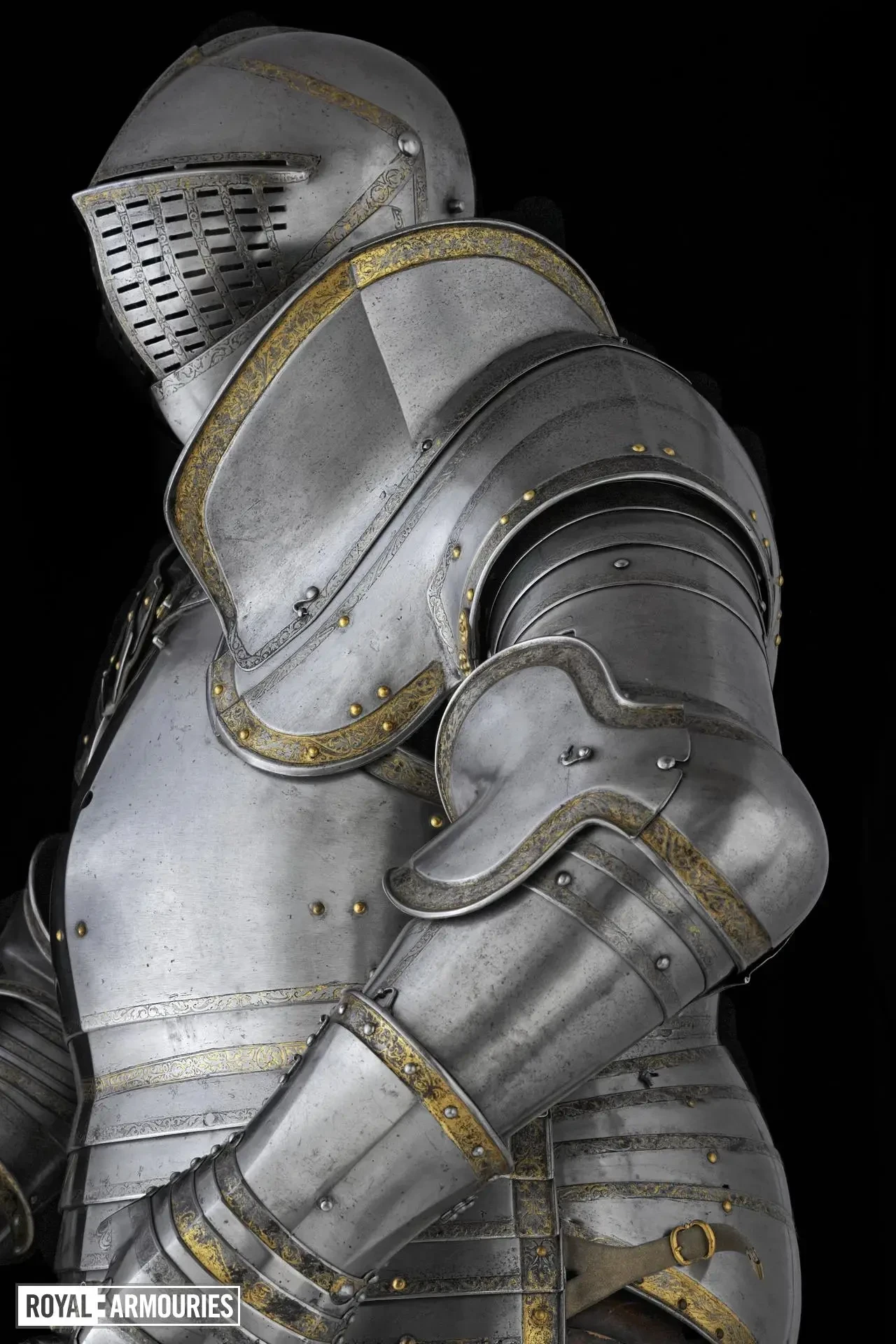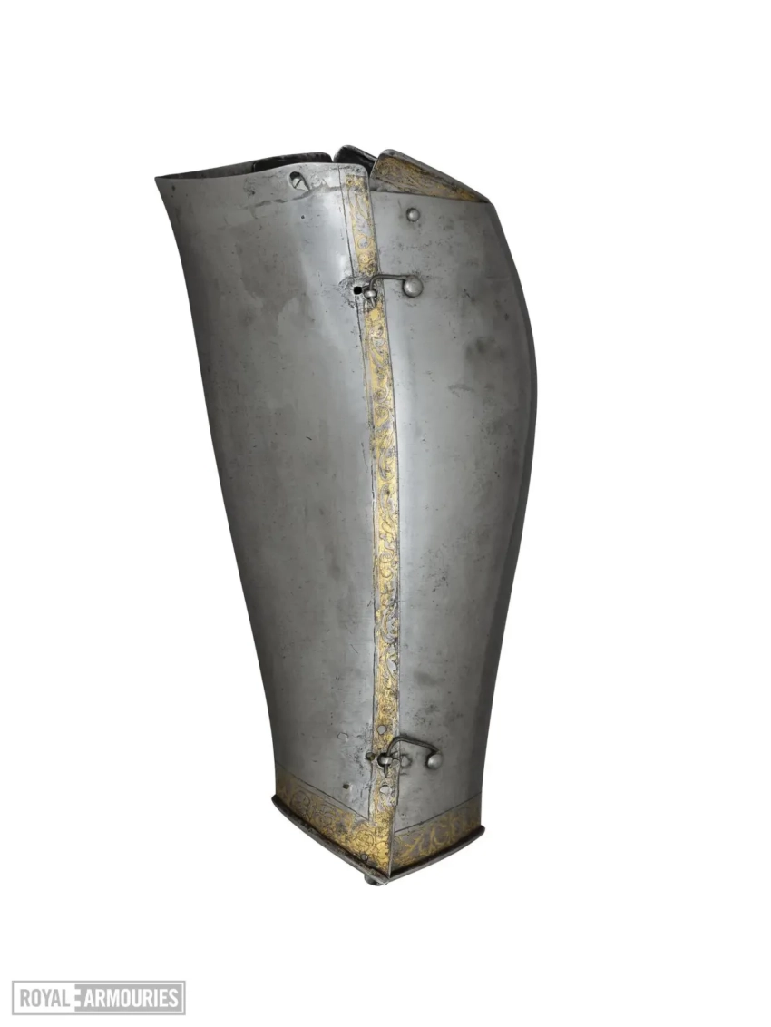 Наплечники разного размера: левый больше, причем верхняя часть его пластины продолжается в виде вертикального ребра для защиты шеи. Основная пластина правого наплечника также образует защиту шеи, но ниже, наплечник неглубокий спереди, чтобы обеспечить опору для копья. Следует отметить, что нагрудник не предназначен для крепления крюка для копья, что подразумевает, что изначально эти доспехи были снабжены альтернативным нагрудником и предназначались для конной схватки. Но затем к ним приделали «юбку» и они превратились в доспехи для пешего турнира!