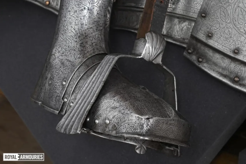 Наколенники с изображением на пластинах «раковин» пучка стрел Арагона и объединенного герба Тюдоров и Екатерины Арагонской – половинки розы и цветка граната