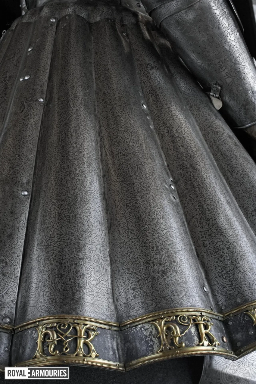 Поверхность всех доспехов изначально была посеребрена и позолочена, а основа гравюры была заштрихована для ее сохранения; в нескольких местах серебро сохранилось. Край «юбки» украшают позолоченные буквы «Г» и «К» — Генрих и Екатерина, то есть в этих доспехах Генрих VIII, видимо, должен был красоваться на своей свадьбе с Екатериной Арагонской! А вот и размеры деталей этого доспеха: высота кирасы 356,0 мм, ширина кирасы 324,0 мм, высота шлема 298,0 мм, ширина шлема 190,5 мм, вес шлема 3,215 кг. Общий вес 30,113 кг.