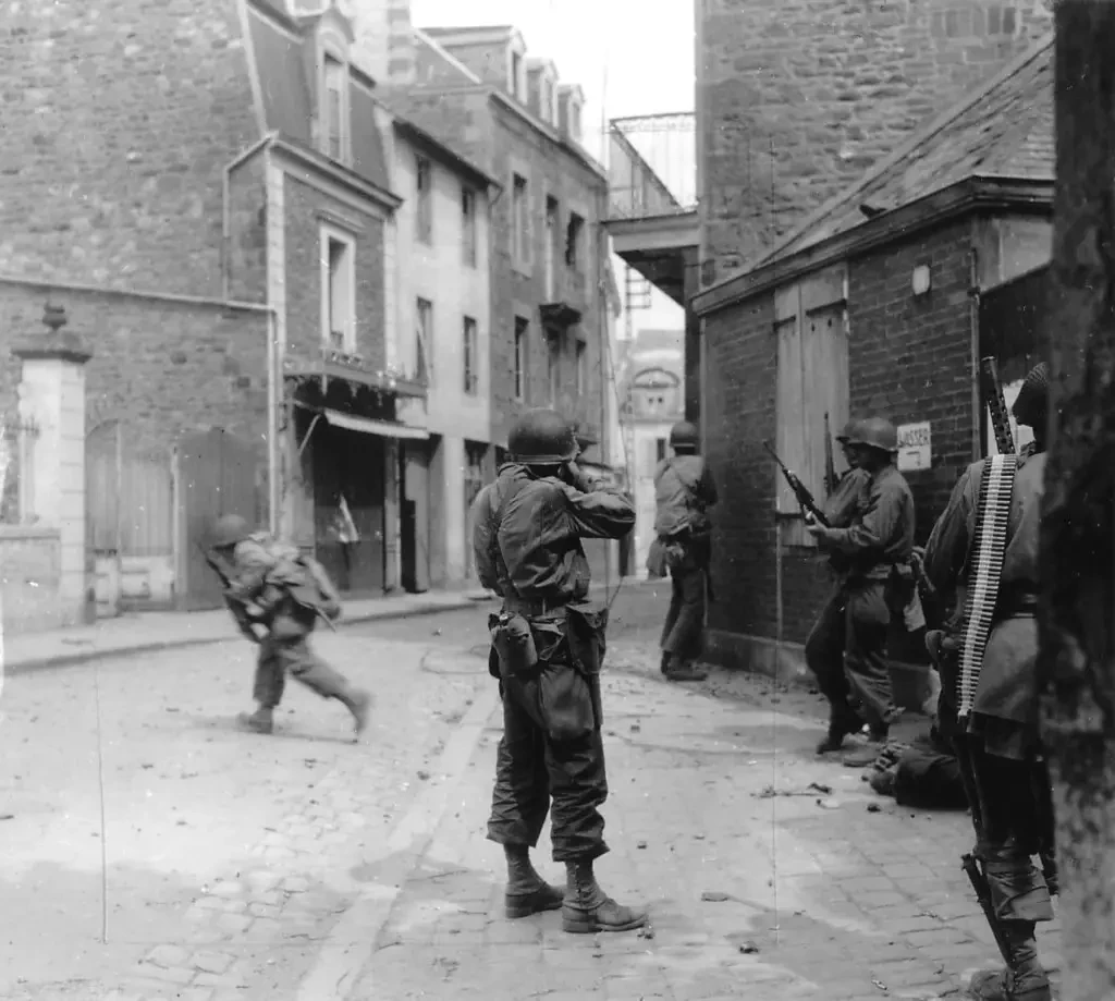 Американские солдаты ведут бой на улице Сен-Мало