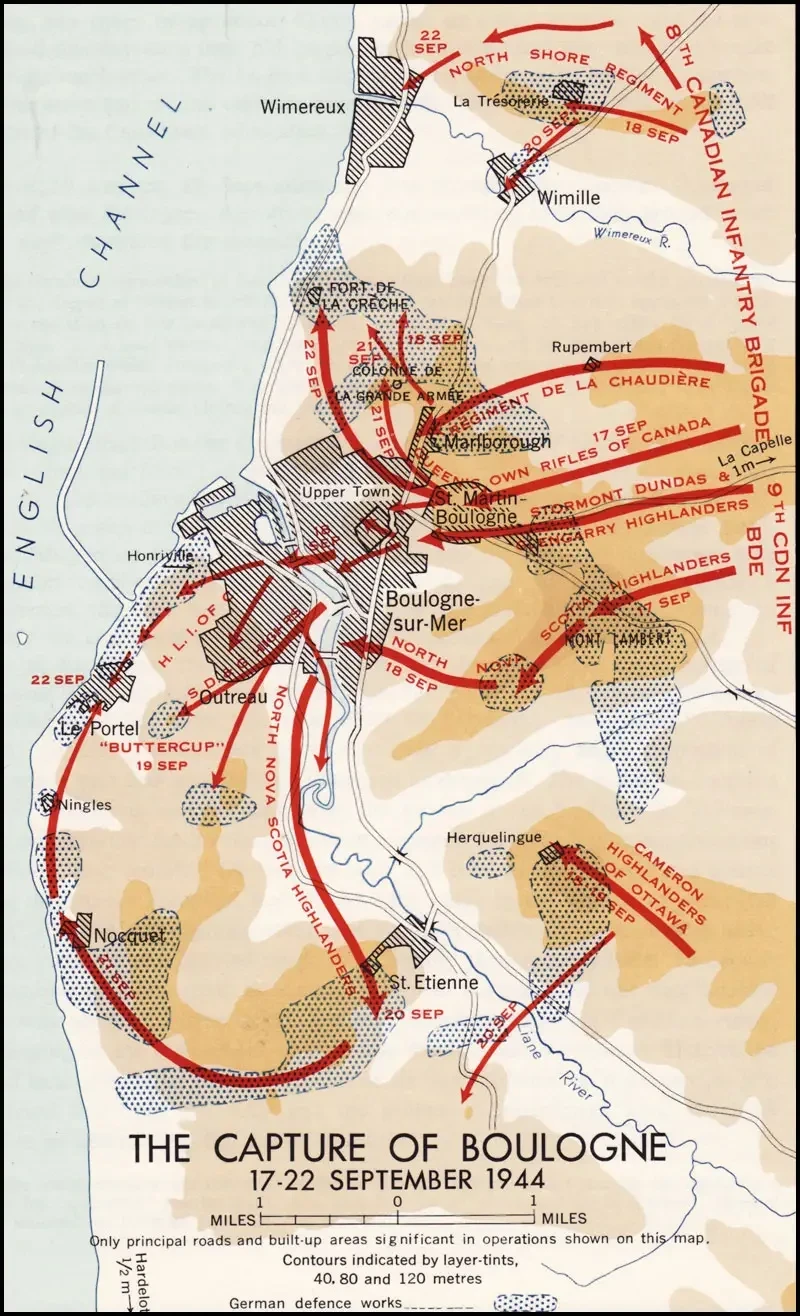 На этот раз союзники совершили «благородный акт» — по просьбе немецкой стороны позволили мирным жителям Булони и Кале покинуть места боев. Кроме сотен бомбардировщиков наступление канадцев поддерживала дальнобойная береговая артиллерия с английского побережья. К 30 сентября в руках союзников оказался участок побережья от Шербура до Кале, в плен попало около 30 тысяч немцев, потери их противников составили около 1500 человек. Но порты были надолго выведены из строя.