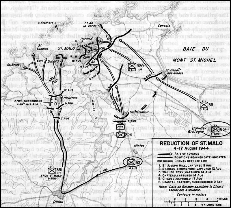 Бои за Сен-Мало продолжались с четвертого до семнадцатого августа, а близлежащий островок Сесамбр (Cézembre) продержался до 2 сентября. При этом для обороны немцы использовали многочисленные старинные форты (в XVI-XVII Сен-Мало был столицей французских корсаров, таких как Дюге-Труэн и Сюркуф, его грандиозные городские укрепления создавались по проектам знаменитого инженера-фортификатора Вобана). С моря их поддерживала шестиорудийная (трофейные французские 1870 года) 194-мм береговая батарея с острова Сесамбр. В свою очередь, союзники «смягчали» оборону противника массированными бомбардировками. В результате старинный город превратили в груду развалин.
