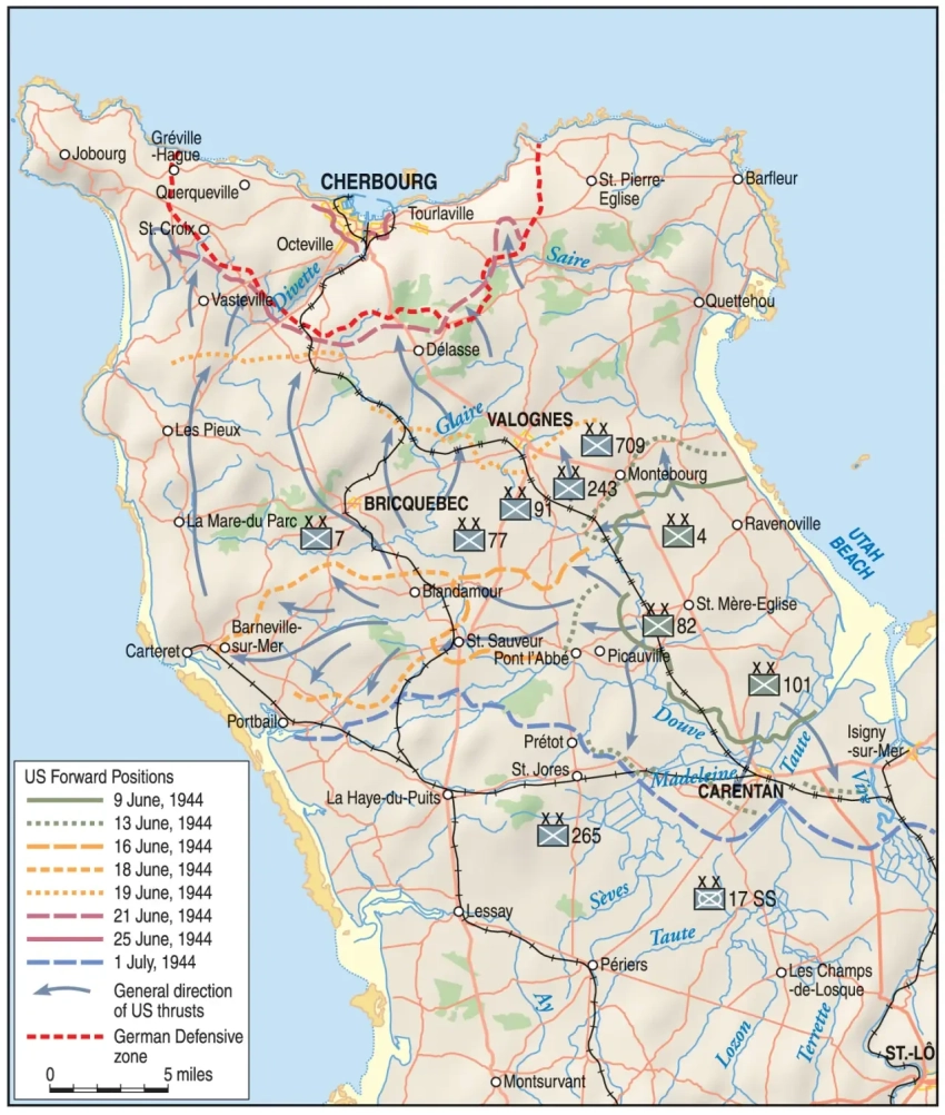 Взять Шербур с ходу не удалось из-за упорного сопротивления немецких частей, и бои продлились с 6 июня до 1 июля. 18 июня американские войска отрезали немецкие войска на севере полуострова Котантен, а через два дня три дивизии «янки» штатной численностью 45 000 человек начали штурм портового города.