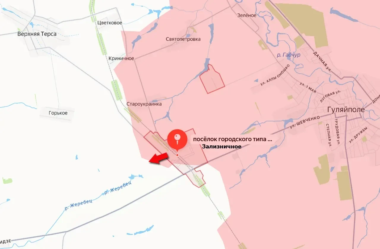 Сегодня Вооружённые силы России добились успеха в пгт Зализничное, освободив большую часть села. При этом под контроль ВС РФ перешёл и участок железной дороги. В результате наступательных действий и уничтожения противника на позициях российские подразделения вышли западнее железнодорожной ветки в Зализничном и взяли под контроль участок автомобильной дороги, ведущей в направлении села Верхняя Терса. В этом селе сходятся сразу несколько важных для восточной части Запорожской области автодорог, включая дорогу на Орехов.