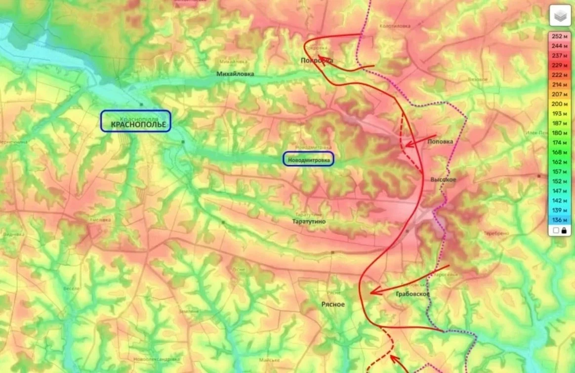 Сумская область: то, что начиналось как рейды ДРГ, перерастает в полноценную операцию. В Глуховском районе идет работа по срезанию выступа Уланово-Бачевск. Южнее, в районе Краснополья, ВС РФ освободили хутор Поповка и зашли в лесной массив восточнее Новодмитровки.