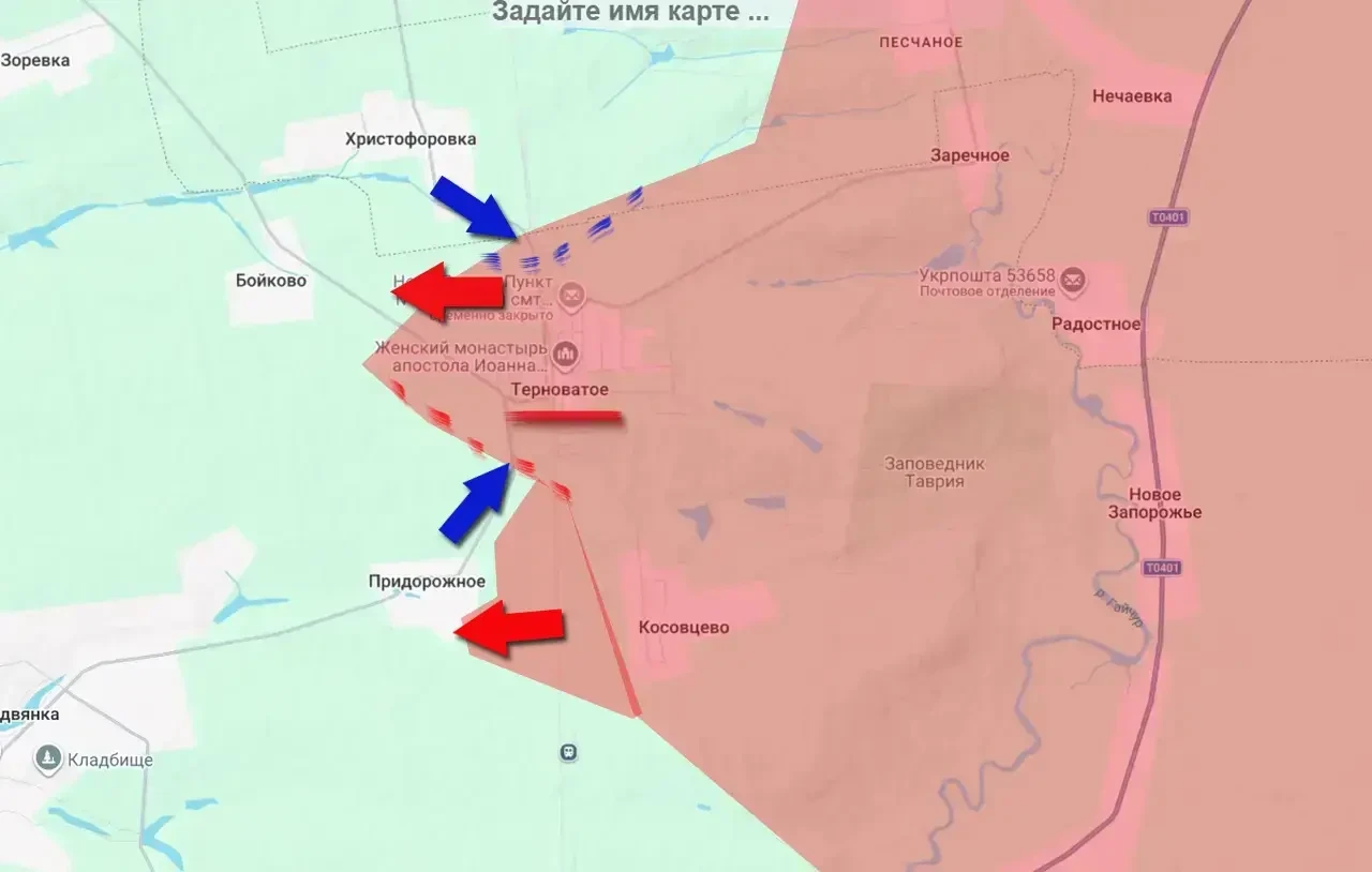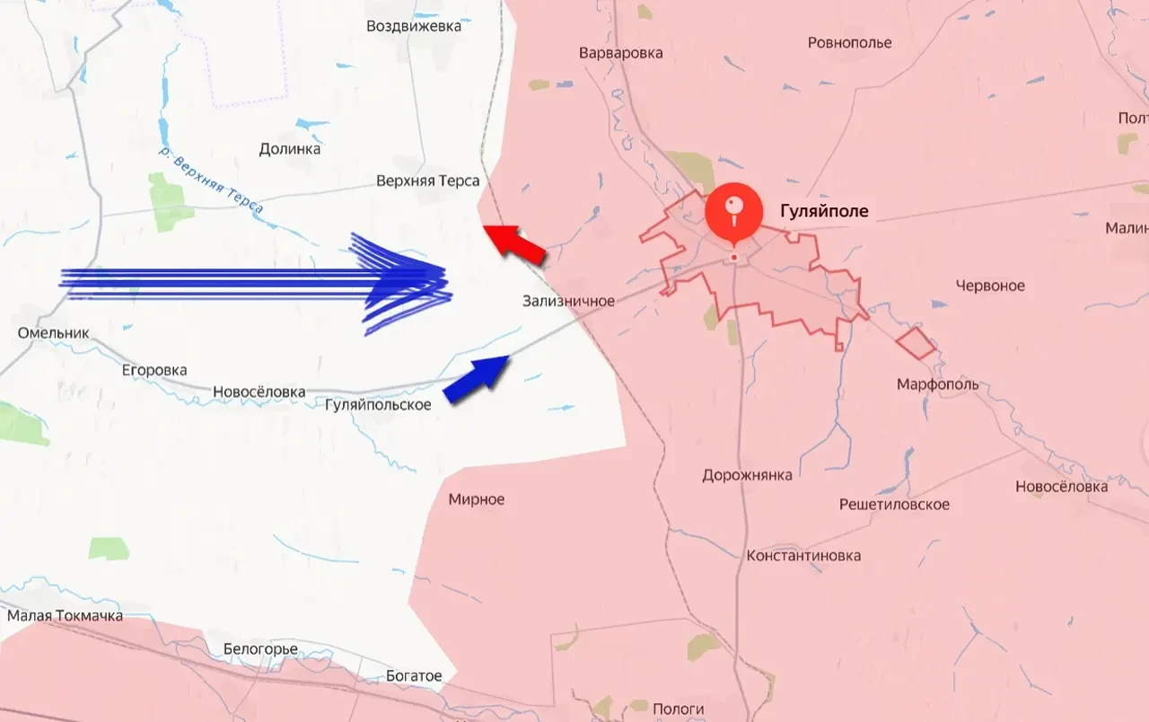 «Заруба» идёт южнее населённого пункта Верхняя Терса. Сам он пока находится под контролем ВСУ. Противник бьёт из РСЗО со стороны Омельника и предпринимает попытки штурмов со стороны села Гуляйпольское. В свою очередь российские войска наносят контрудары к северо-западу от Зализничного, создавая давление на те позиции ВСУ, которые не были в достаточной степени укреплены после отступления остатков Гуляйпольского гарнизона украинских войск. Также по пытающемуся продвигаться к Гуляйполю противнику бьют дроноводы.