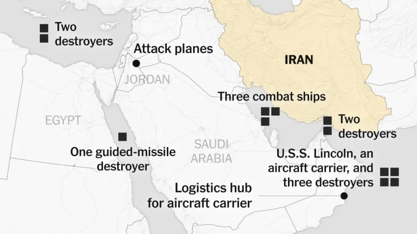 Соединенные Штаты провели одну из крупнейших региональных мобилизаций со времен ударов по иранским ядерным объектам в 2025 году. В Аравийском море находится авианосная ударная группа «Авраам Линкольн», оснащенная истребителями F-35 и F-18, ракетами «Томагавк» и самолетами радиоэлектронной борьбы. Пентагон привел в боевую готовность второй авианосец — «Джордж Буш», что потенциально может привести к появлению в регионе двух авианосцев, чего не наблюдалось уже почти год. Кроме того, в регион переброшены истребители F-15E Strike Eagle, системы THAAD и Patriot, а также более 40 000 военнослужащих на базы в Иордании, Кувейте, Бахрейне, Саудовской Аравии и Катаре.