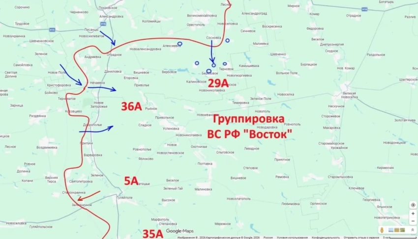 Вместе с этим российские подразделения из группировки "Восток" продолжают наступление по направлению к населённому пункту Верхняя Терса, где им практически удалось выйти на его окраины.