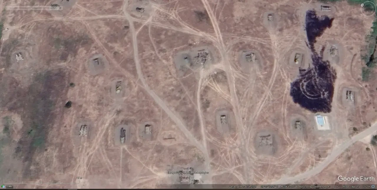 Спутниковый снимок Googlе Eаrth: позиции двух батарей ЗРК «Круг» восточней посёлка Аскеран. Снимок сделан в июне 2019 года