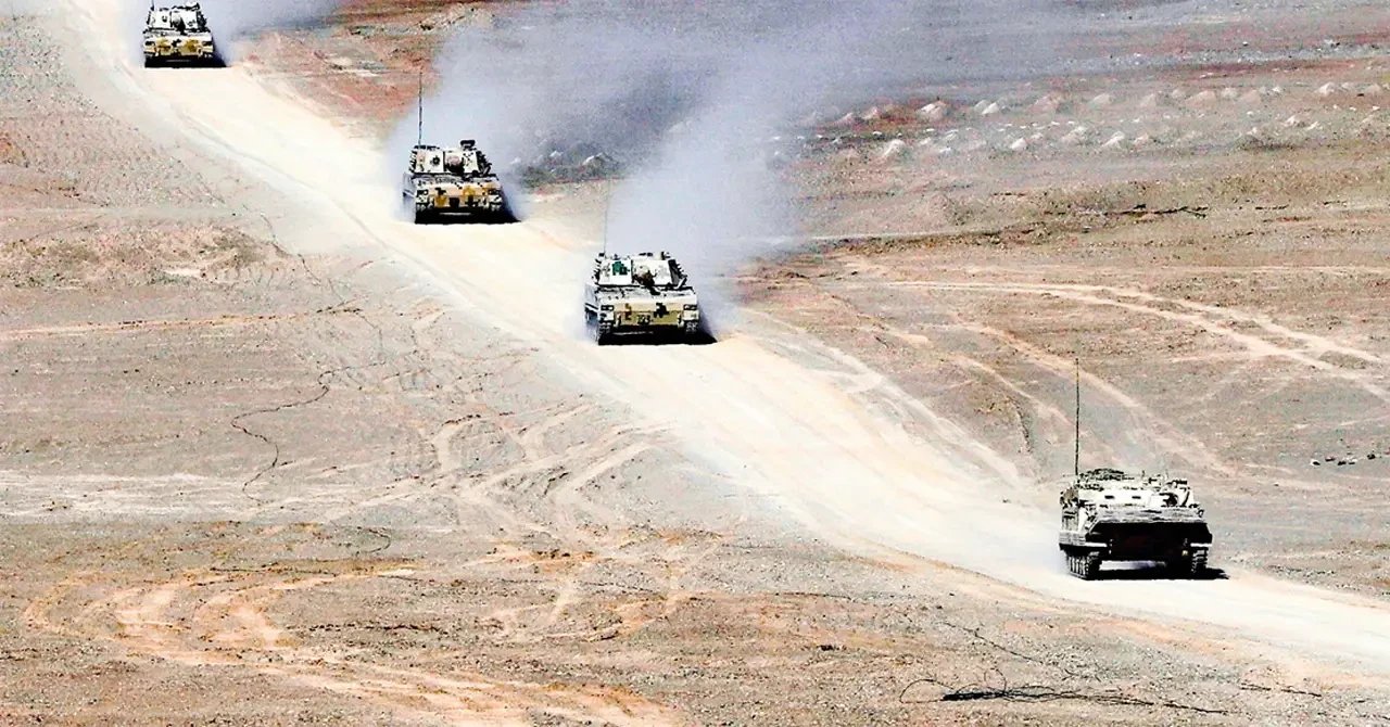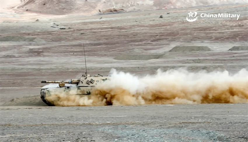Китайские войска провели очередные маневры с бронетехникой в гористой местности. На этот раз отрабатывалась переброска тяжёлой техники в заданный район для последующих стрельб по целям.