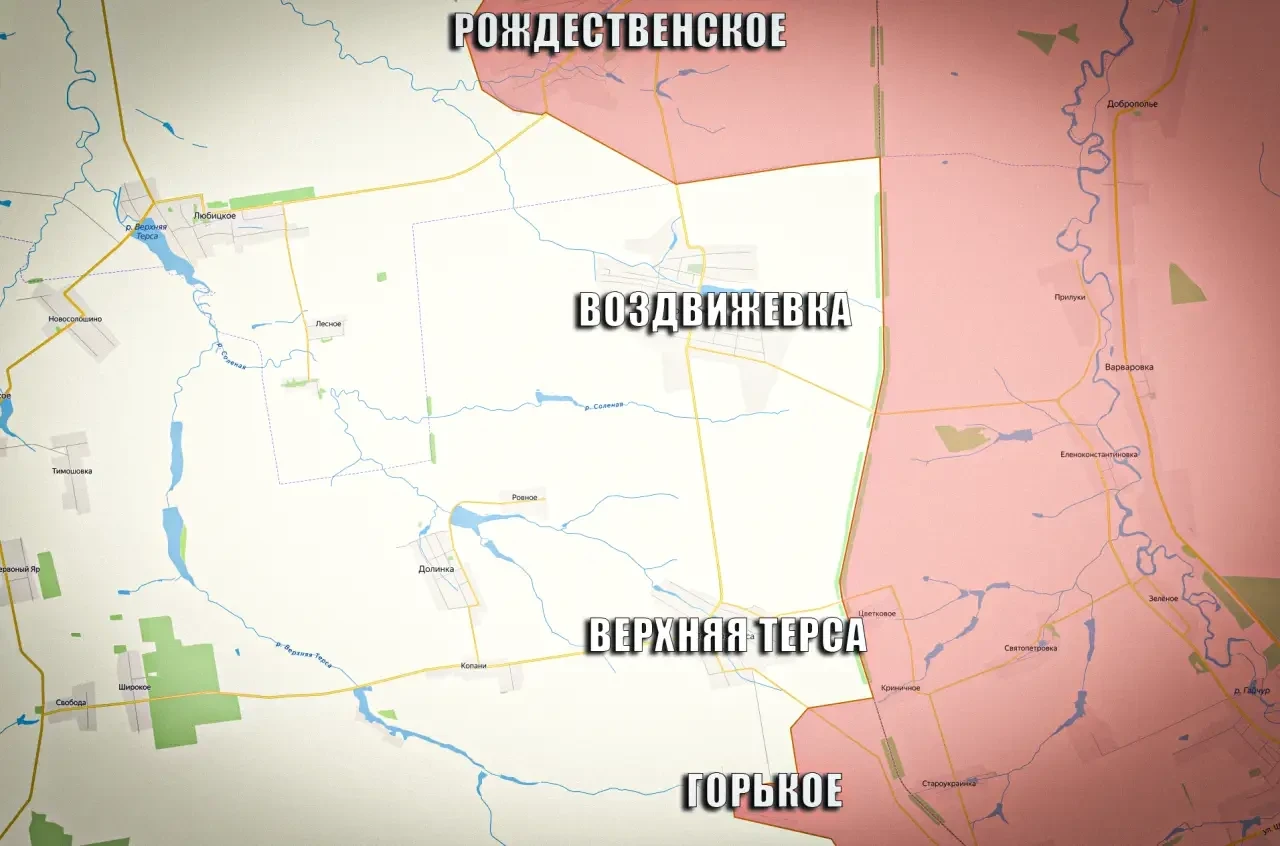 Интересно, что севернее Воздвижевки и Верхней Терсы ВС РФ ранее освободили Рождественское. Это в совокупности с занятым селом Горькое открывает возможность зажать оккупированные украинскими боевиками населенные пункты с двух сторон.