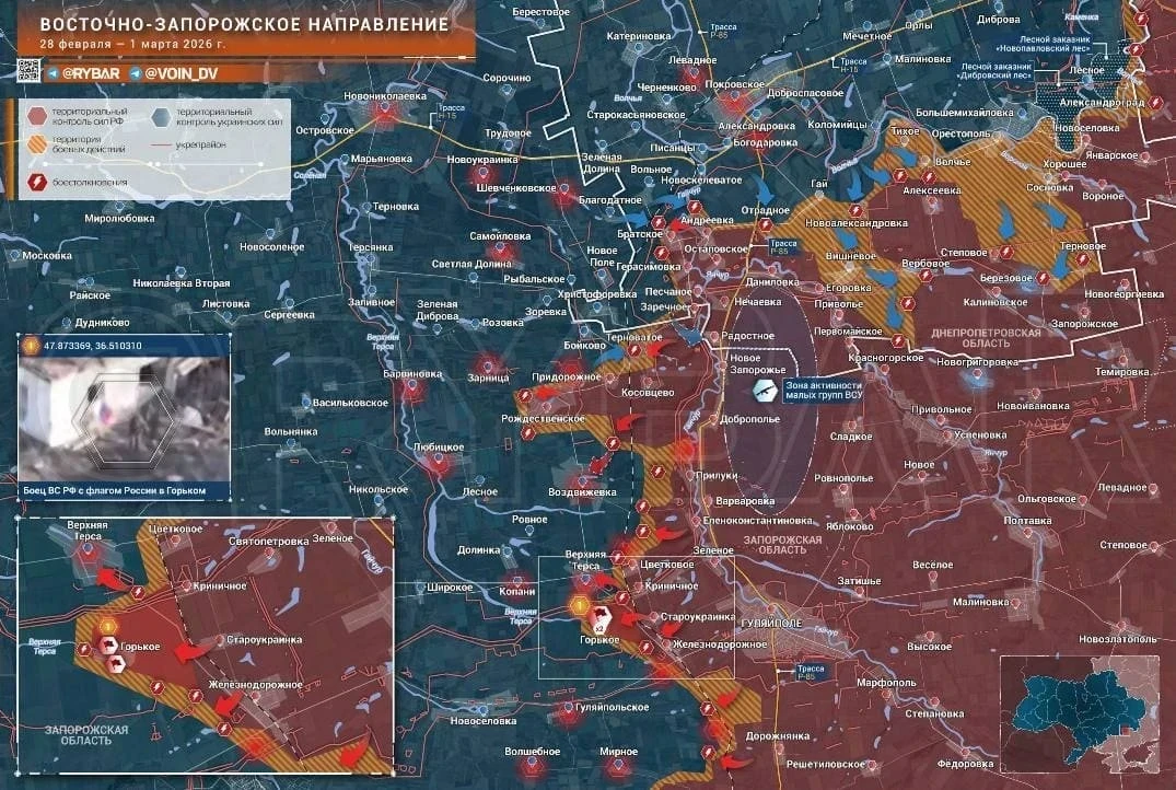 Настоящий оперативный успех фиксируется на Гуляйпольском участке. После вчерашнего освобождения населенного пункта Горькое, подразделения ВС РФ сформировали мощный плацдарм. Отсюда готовится штурм Верхней Терсы (до южных окраин села остается менее трех километров).
