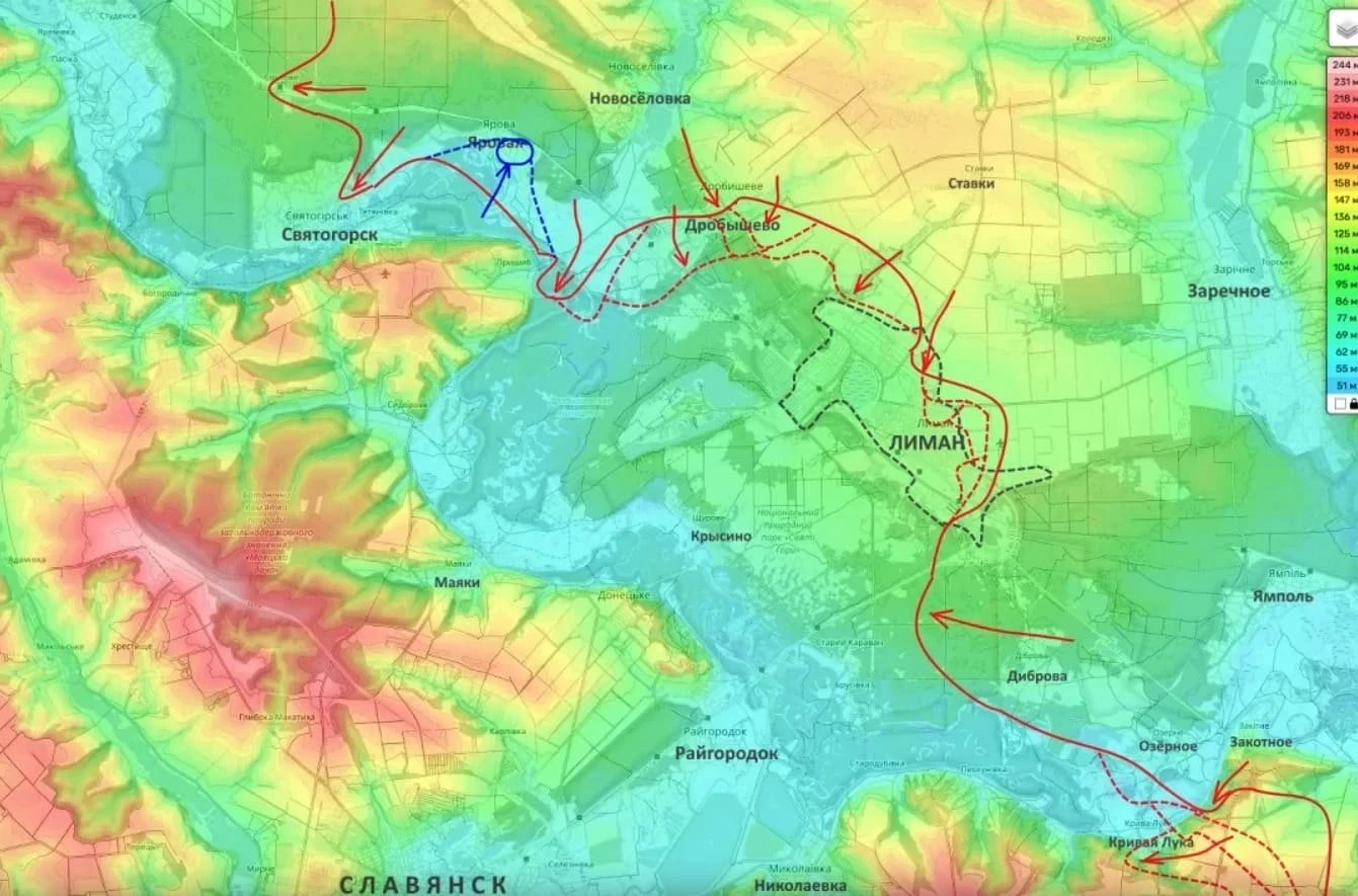 Блогер отметил, что российские военные все сильнее сжимают полукольцо окружения вокруг группировки ВСУ в Красном Лимане. По словам Подоляки, войска РФ усилили охват города, взяв под контроль расположенный неподалеку от него поселок Дробышево.