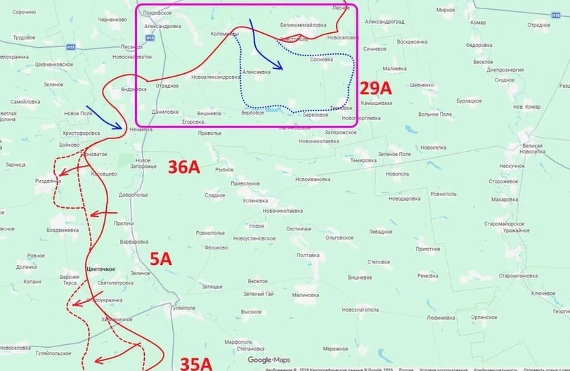 В полосе группировки «Восток», с его слов, российские подразделения, заняв Горькое и выбив противника со значительной части полей и лесополос южнее, сейчас пытаются штурмовать Верхнюю Терсу. Кроме того, ВС РФ подходят с востока к Гуляйпольскому, потеря которого сразу скажется на позициях противника южнее, в районе населённого пункта Чудесное и далее по лесополкам до Белогорья.