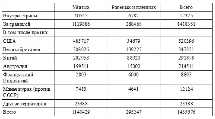 Итого, вооруженные силы Японии потеряли суммарно 1864710 человек, в том числе 1555308 человек убитыми и 309402 человека ранеными и пленными.
