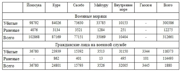 Всего военно-морской флот насчитывал потери в 429034 человека, в том числе 414379 убитых и 14155 раненых; из них военных моряков — всего 312661, в том числе убитых 300386, раненых 12275, и гражданских лиц на военной службе — всего 116373, в том числе убитых 114493, раненых 1880.