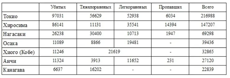 Из этой таблицы видно, что самым пострадавшим местом в Японии был Токио, сгоревший после налета 10 марта 1945 года. На втором и третьем местах идут пострадавшие от ядерной бомбардировки Хиросима и Нагасаки. Всего на эти три префектуры приходится 433493 человека погибших и пострадавших, или 64,8% общего числа. На перечисленные в таблице семь префектур приходится 555753 человека погибших и пострадавших, или 83,1% общего числа.