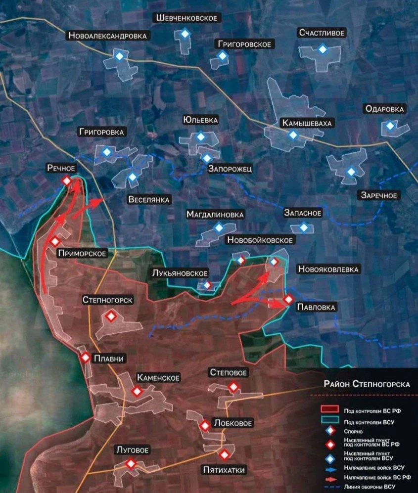 Наши войска возобновили наступление под Степногорском, полностью нивелировав результаты недавних контрударов ВСУ. Противник, пытавшийся закрепиться в Приморском и Лукьяновском, был отброшен на 4 километра назад.