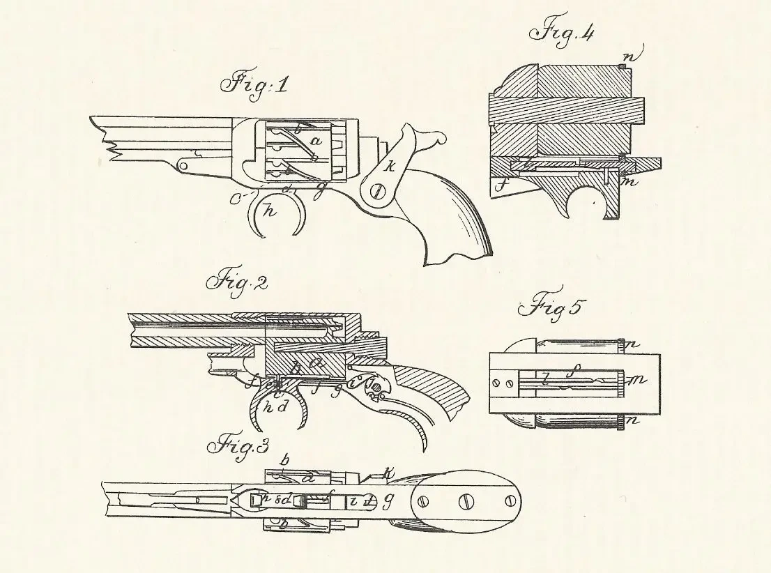 Патент Рута 1855 года на револьвер с канавками «зиг-заг» на барабане. Спусковой крючок в виде кольца имел штифт, входивший в одну из этих канавок. При движении назад спусковой крючок одновременно заставлял проворачиваться барабан!