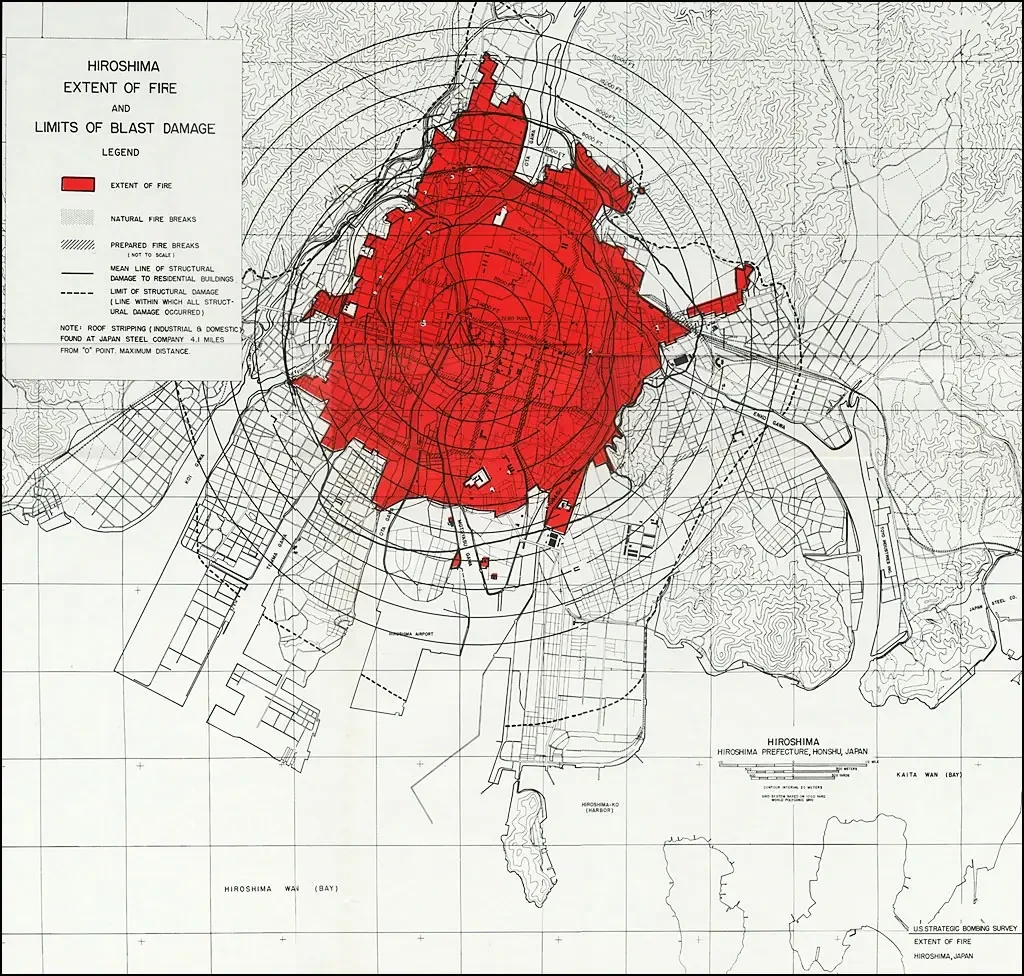 Американцы утверждали, что они провели всеобъемлющее исследование разрушений в Хиросиме, в частности были изучены и сфотографированы все поврежденные капитальные сооружения. Фотоархив должен быть большой. Но нам из него показывают лишь небольшую часть наиболее разрушенного района Хиросимы.