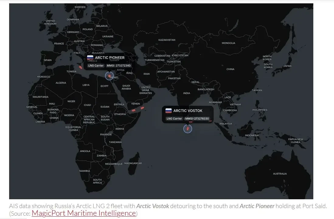 P.S. По сообщениям СМИ, газовозы так называемого «теневого флота», участвующие в перевозке газа проекта LNG-2, резко изменили маршруты. «Arctic Pioneer», который во время происшествия выходил из Суэцкого канала, бросил якорь у Порт-Саида и до сих пор там находится. «Arctic Vostok», находившийся в Индийском океане и следовавший в западном направлении, сначала резко замедлился, а затем изменил курс на юго-западный, видимо решив не ходить Суэцким каналом, а обогнуть Африку.