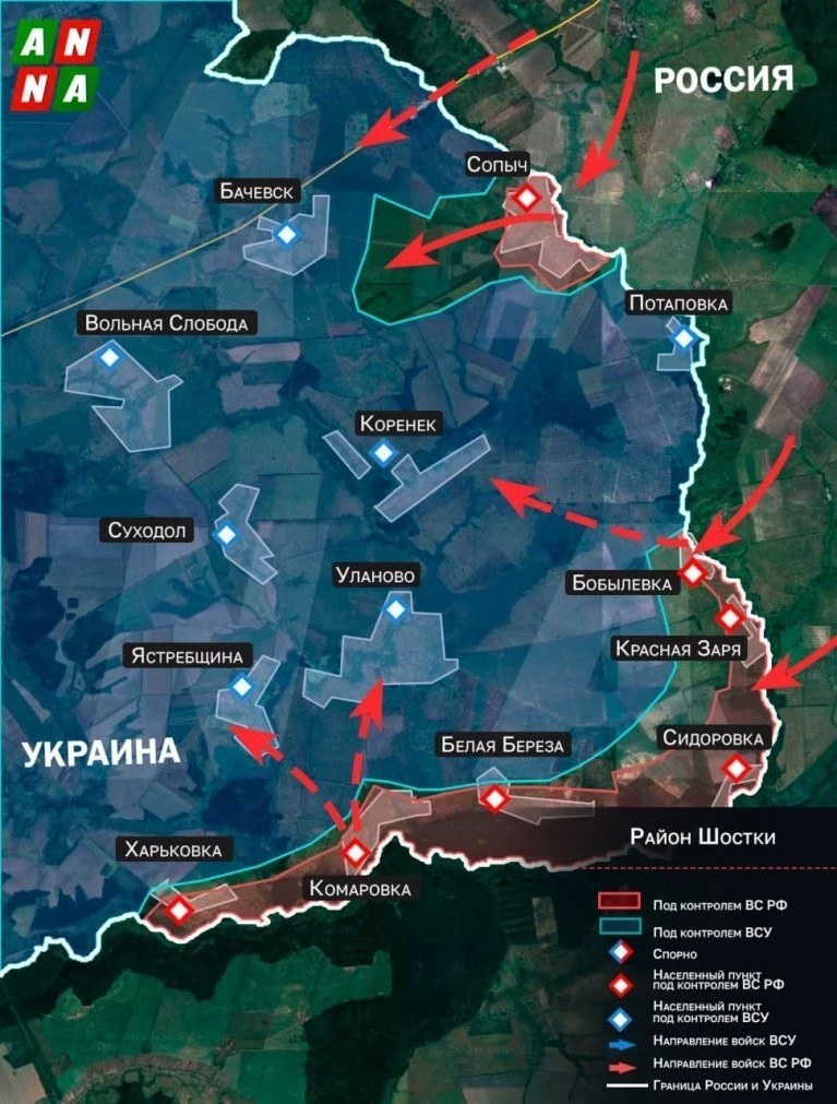 Под контроль перешли семь населенных пунктов, включая стратегически важную Сопичь. От нее российские штурмовики продвинулись на 3,5 км в сторону Бачевска.