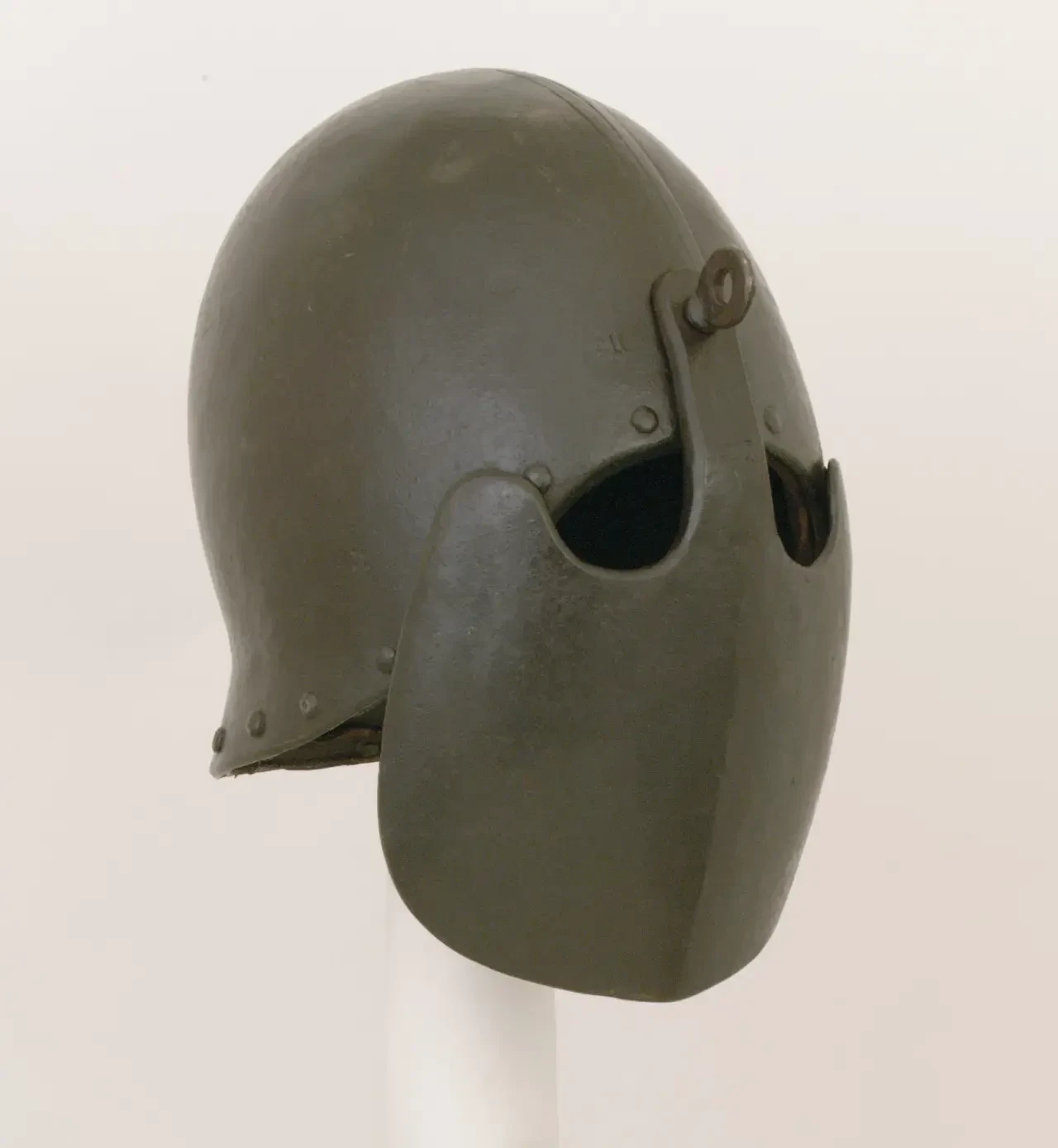 По словам Дина, всего было изготовлено сорок таких шлемов, что делает этот экземпляр особенно редким и ценным. Шлем состоит из четырех стальных пластин, окрашенных в зеленый цвет: одна пластина образует поля и переднюю часть шлема; другая образует заднюю часть шлема с хвостовой частью, которая доходит до основания шеи; боковые части шлема образованы двумя фигурными нащечниками, которые накладываются друг на друга спереди и на края хвостовой части в центре сзади. Пластины шлема соединены заклепками; нащечники приклепаны к одному горизонтальному шарниру с обеих сторон шлема у основания черепа.