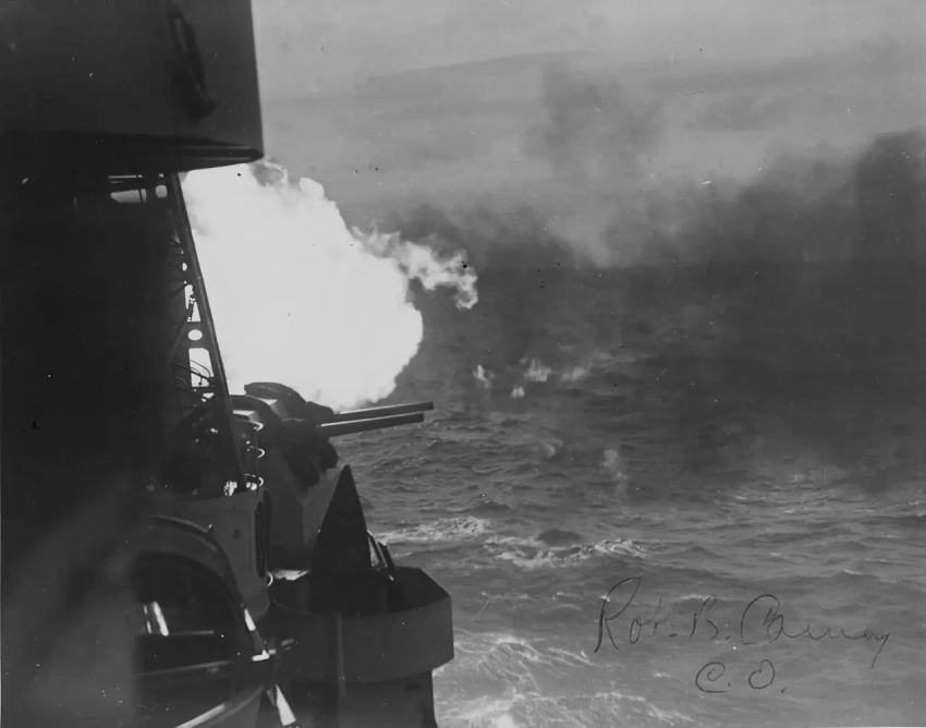 «Сигуре» и «Самидаре» обстреливают позиции союзников у Бугенвиля на Соломоновых островах за несколько часов до морского сражения у Велья-Лавелья 7 октября 1943 года.