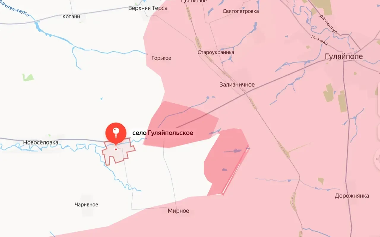Теперь поступают сведения о продвижении на глубину до 3 км от тех позиций, которые ранее были заняты российскими войсками западнее указанного выше села. В результате нового продвижения ВС РФ достигли восточных окраин села Гуляйпольское, расположенного по обоим берегам реки Жеребец.