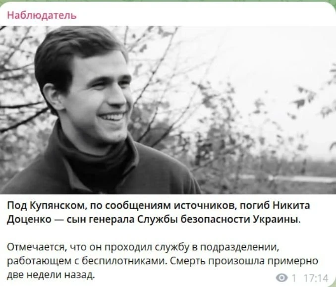 Украинская пресса на днях запестрела сообщениями о смерти 24-летнего старлея Никиты Доценко. Пишут, что он служил в отделении беспилотных авиационных комплексов 138-го Центра специального назначения ВСП ВСУ. Позывной - "Дос".