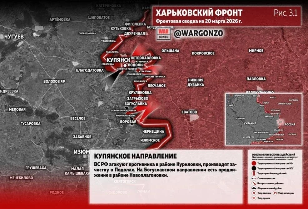 По состоянию на 20 марта известно, что российские силы атакуют противника в районе Куриловки. Также идёт зачистка в Подолах, где продолжается работа по выдавливанию украинских формирований с занимаемых позиций. На Богуславском направлении фиксируется продвижение в районе Новоплатоновки. Эти участки в совокупности показывают, что российское командование сохраняет наступательную активность и стремится постепенно расширять зону контроля сразу на нескольких отрезках фронта.