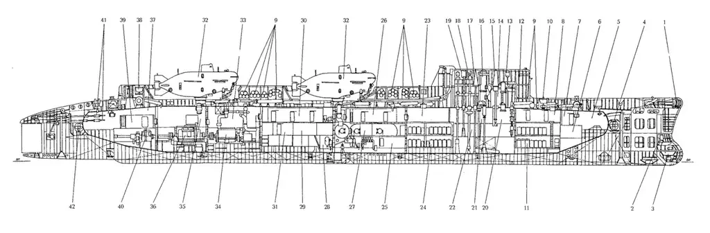 За ограждением прочной рубки находится высокий банкет с местами для размещения двух спасательных глубоководных аппаратов и защиты их от волнения моря вплоть до 8 баллов.