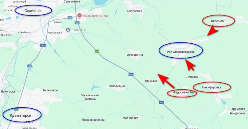 Российские войска продолжают с боями продвигаться к Славянску сразу с нескольких направлений. Наступление идёт с востока от Северска, здесь наши войска взяли 17 марта село Каленики, от которого до Славянска по прямой меньше 14 км. Также наступление идёт с юго-востока, фактически вдоль трассы Артёмовск - Славянск. Тут наши бойцы взяли Федоровку Вторую неделю назад и сегодня освободили соседнюю Никифоровку, передаёт "Военное обозрение".