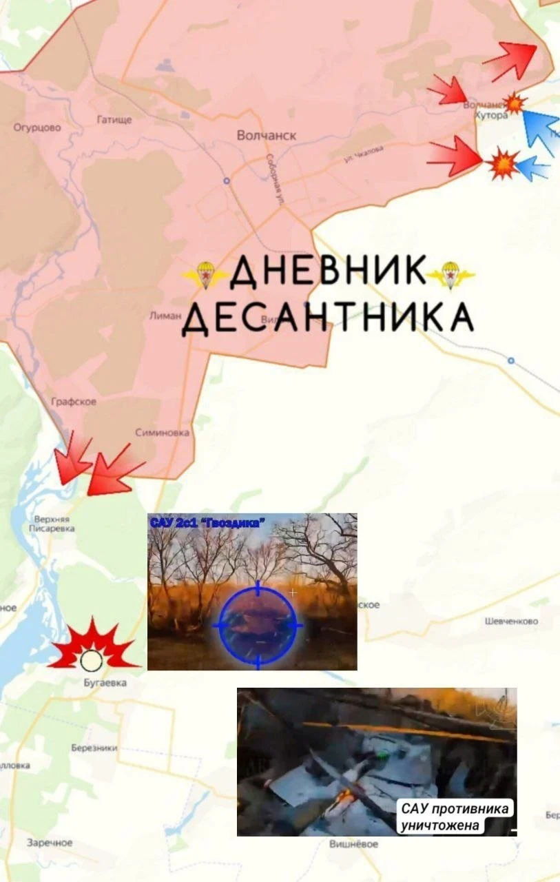 FPV-дроны и артиллерия активно поддерживают наступление, уничтожая технику и огневые позиции противника. Под Бугаевкой поражена украинская САУ «Гвоздика», под Колодезным сбит БТР М113. Также ликвидированы позиции миномётчиков и радиолокационная станция ПВО.