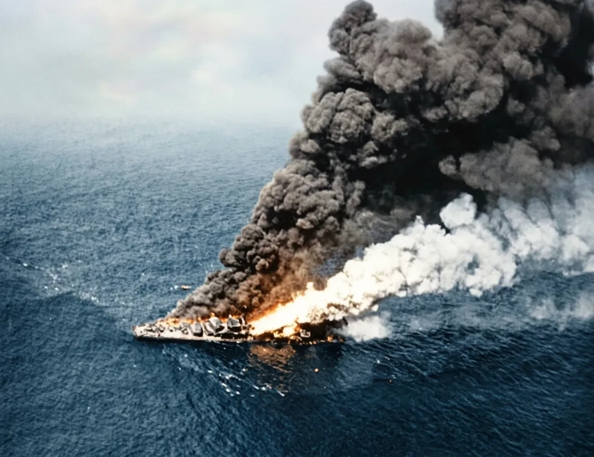 В 13:08, когда первая волна авианалётов подходила к концу, 150-килограммовая бомба, сброшенная с SB2C Helldiver с авианосца «Эссекс» (CV-9), попала в переднюю часть мостика, пробив большую дыру в полубаке, на верхней палубе и в правом борту. Башни № 1 и № 2 получили серьёзные повреждения, и все отсеки, кроме боезапаса в башне № 1, были затоплены.