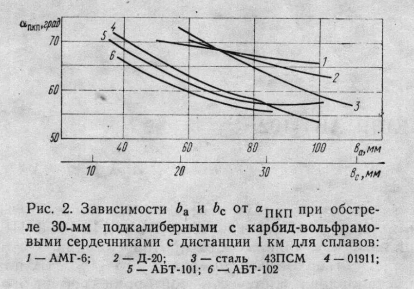 В связи с появлением в армиях НАТО высокоскоростных подкалиберных снарядов с карбид-вольфрамовым сердечником весьма интересны испытания алюминиевой противоснарядной брони такими снарядами (рис. 2). Результаты сравнительных испытаний ряда алюминиевых материалов, стали 43ПСМ и брони АБТ-102 30-мм моделями подкалиберных снарядов также показывают значительное превосходство брони из сплава АБТ-102.