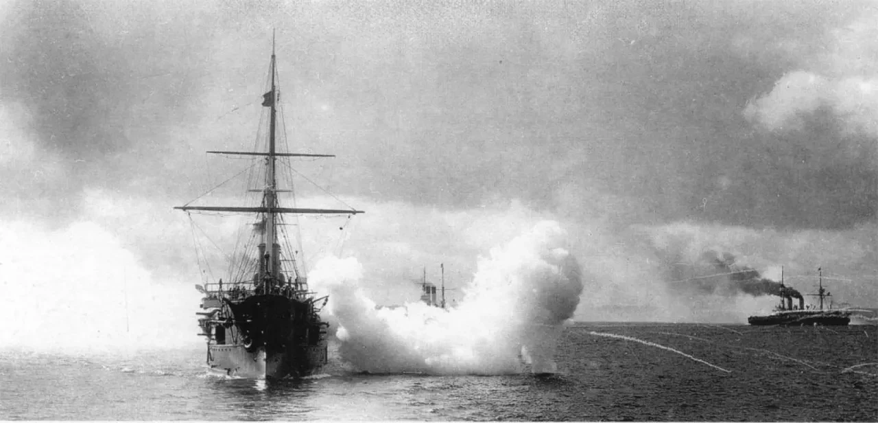 Эскадренная контр-галсовая стрельба. Для орудий среднего и крупного калибра применялись 37-мм патроны, 47-мм пушки стреляли «ядрами», то есть учебными снарядами-болванками. Интересно, что 75-мм пушки в данном упражнении не производили выстрелов совершенно, но их расчетам полагалось отрабатывать наводку по щитам без выстрелов.