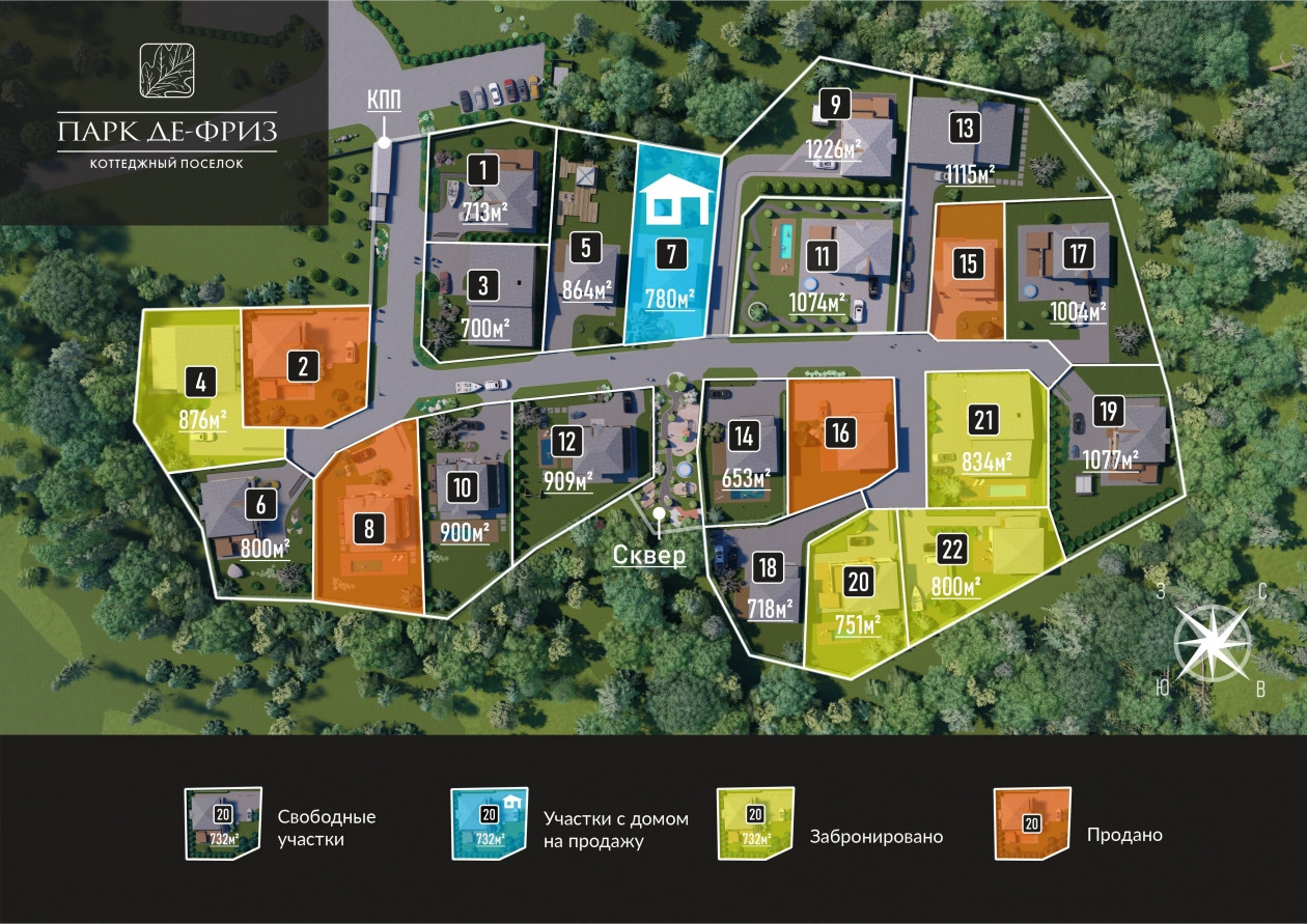В КП “Парк Де-Фриз” будет всё для уединённой, комфортной и безопасной загородной жизни. Сейчас активно идёт благоустройство посёлка. На въезде установлен арт-объект “Я дома”, оформлена входная группа. Территория огорожена по периметру, есть КПП и система видеонаблюдения. Ведутся работы по бетонированию внутрипоселковых дорог. Все земельные участки готовы к началу строительства: проложены все необходимые коммуникации, сделаны земельные работы, активно строятся лицевые заборы в едином стиле.