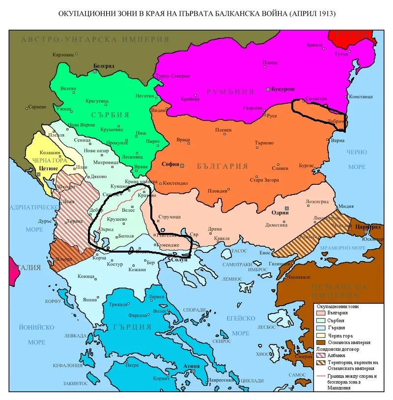 Балканы в кризисное лето 1913 г. Районы территориального конфликта (южная Добруджа и Македония) обведены чёрным