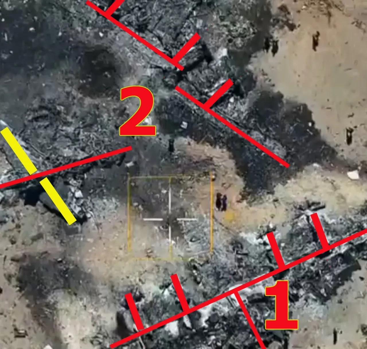Однако то, что осталось от транспортных самолётов, красноречиво характеризует их «предударную» конфигурацию. Самолёты находились на очень близком расстоянии друг от друга. И это совершенно не случай, когда взрывной волной один многотонный транспортник вдруг отбросило за сотни метров именно к другому самолёту, причём с сохранением контуров их конструкции (показаны оси самолёта, контуры двигателей на крыльях, оси самих крыльев, хвостовая часть одного из MC-130). Это было бы невозможно физически. А тут расстояние между самолётами вдруг менее 10 м.