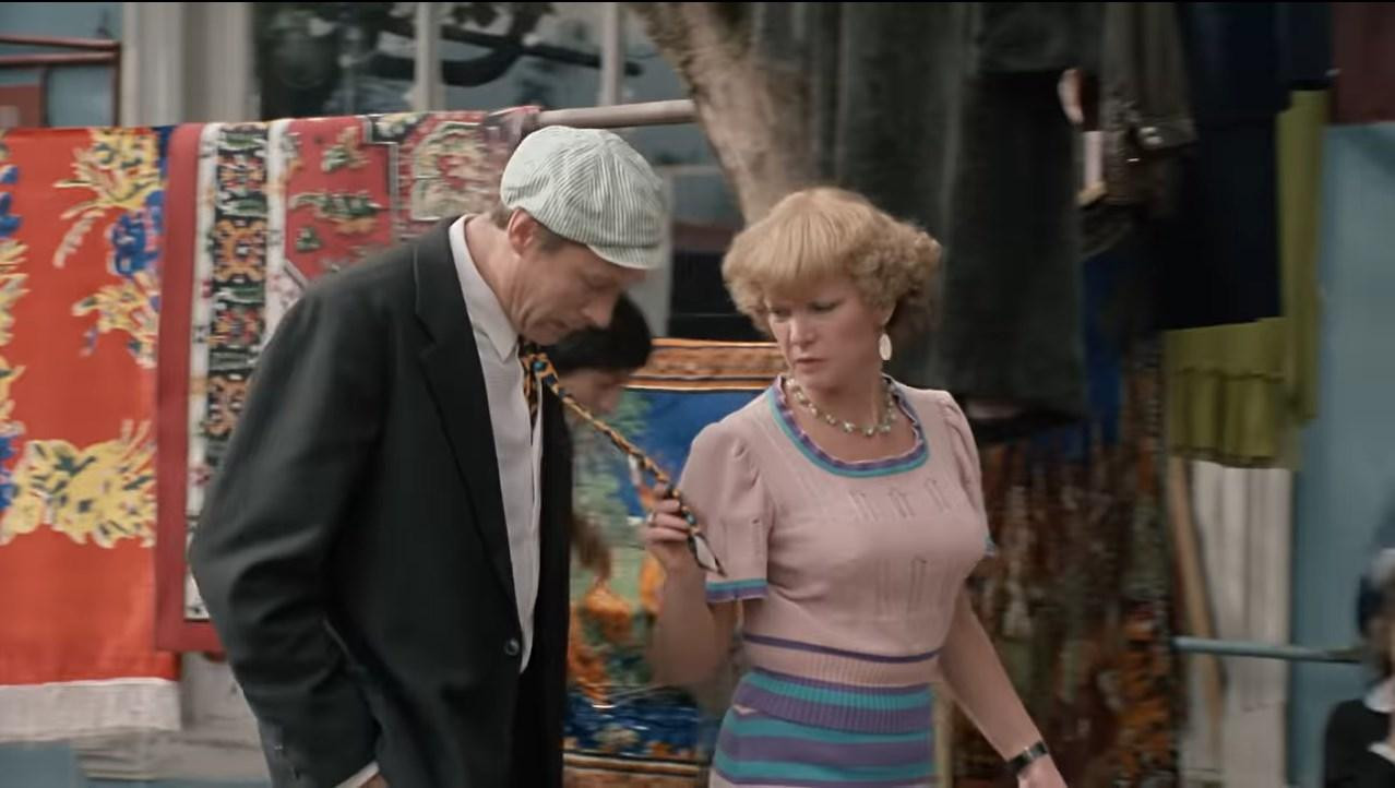 В одной из следующих сцен пара находится на рынке, где Раиса Захарова рассматривает простой желтый галстук с фигурками, полученный новым приятелем в подарок от жены. Затем героиня предлагает Кузякину обратить внимание на другой аксессуар. Причем, зрители видят на экране тот самый стильный галстук синего цвета, в котором персонаж уже появлялся в спортзале.