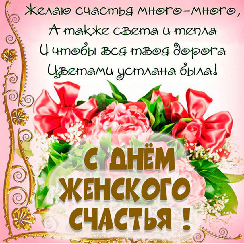Поздравляю тебя с Днем женского счастья сегодня, Обладай им всегда, настоящим и истинным, Только ты знаешь, что приносит тебе счастье, Ведь для каждого оно уникально всегда! Будь наполнена восторгом, как дети, Свежей, словно майский дождь, Будь самой любимой на всей планете, И получай все, ради чего ты живешь на этой земле!