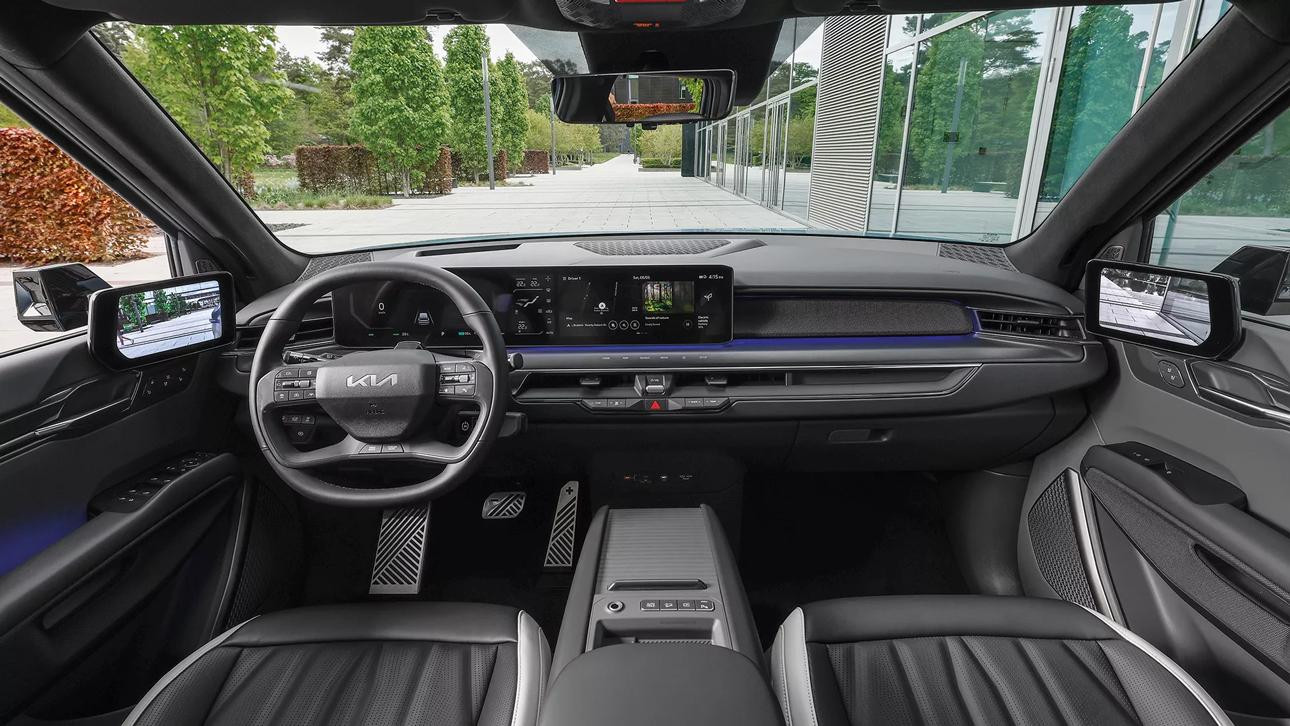 Интерьер KIA EV9 считается уникальным и практичным. Салон получил дополнительные поворотные сиденья второго ряда, которые обладают способностью поворачиваться на 180 градусов в условиях остановки автомобиля. Данная особенность позволяет пассажирам взаимодействовать без проблем, а также откидывать кресла. Правда, этой опции не будет в кроссовере для американского рынка.