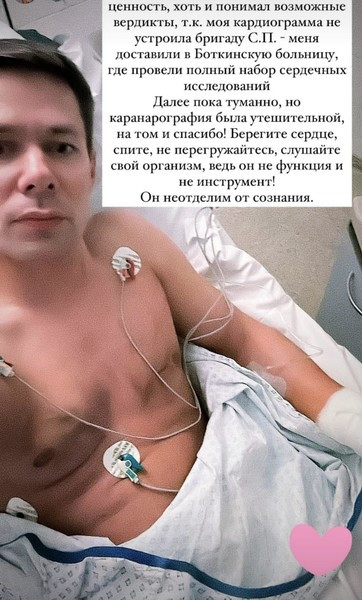 Позже он снова связался со своими поклонниками, уже находясь в медицинском центре. Стаса, 42-летнего артиста, подключили к аппаратам, которые позволяют отслеживать сердечный ритм и выявить любые проблемы в работе одного из главных органов организма.